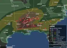 Clusters of storms evolved along these bands in conjunction with improving wind shear profiles. However, given their displacement from the surface low and better forcing, there was some uncertainty as to whether they would become better organized.[19] A strengthening low-level jet and surface moisture increased confidence in the maturation of these cells,[20] but tornadic development had not yet begun in the area as of 0000 UTC. At their 0100 UTC outlook, the SPC lowered the probability of tornadoes to a 10% hatched tornado area, thus downgrading the moderate risk to an enhanced risk, citing that instability in the area was weaker than expected and that there was increased confidence in only limited buoyancy developing.[21] However, as the update was being issued, a significant supercell evolved across western Mississippi, producing a violent, long-tracked, and deadly high-end EF4 tornado that struck Rolling Fork, Midnight, and Silver City, inflicting catastrophic damage, and causing over a dozen fatalities.[22][23] Although this supercell became embedded within a line segment,[24] it soon produced another deadly tornado of EF3 strength that impacted Black Hawk and Winona, followed by another deadly EF3 tornado that struck New Wren and Amory.[25][26] To the north, an organized line of convection with embedded supercells moved across Tennessee and Alabama, and although its strength was inhibited by lower moisture and a lack of robust instability, it still produced damaging winds and several additional tornadoes into the early morning hours of March 25, including a low-end EF2 tornado that caused a fatality in the northern part of Hartselle, Alabama. A few lingering severe storms continued into the afternoon hours, resulting in two more weak EF0 tornadoes that occurred in southern Alabama and Georgia.