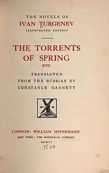 - ↑ Turgenev, Ivan Sergeevich (1897). The torrents of spring. The Novels of Ivan Turgenev. Vol. ix. Translated by Constance Garnett. New York: Macmillan.