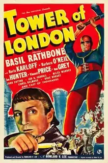 Tower of London is a 1939 black-and-white historical film directed and produced by Rowland V. Lee. It stars Basil Rathbone as the future King Richard III of England, and Boris Karloff as his fictitious club-footed executioner Mord. The film is based on the traditional depiction of Richard rising to become King of England in 1483 by eliminating everyone ahead of him. Each time Richard accomplishes a murder, he removes one figurine from a dollhouse resembling a throneroom. Once he has completed his task, he now needs to defeat the exiled Henry Tudor to retain the throne.