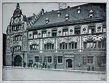 The house facade of the old town hall was painted with scenes from a dance of death in 1559. At the behest of the council, the painter Galienus Entringer had to replace his own painting with a history painting with scenes from the life of Philip II of Macedon in 1560. In 1881, Fritz Geiges replaced the neo-Gothic architectural painting of Simon Gösers of 1810 with paintings in the manner of the Renaissance, but those had to be revised in 1886 because of damage. Today, the building is plastered uniformly in sandstone red. The windows are framed in black and gold with colorful portals.[2][3]
