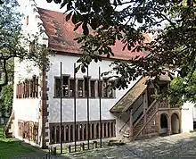 The Gerichtslaube was destroyed in the air raid on Freiburg (Operation Tigerfish) of 1944 almost to the foundations, it remained only parts of the access staircase and the west wall, the annex which contained the archives, including the establishment of 1553 remained almost intact.[3] From 1961, the reconstruction was run by the Kuratorium Gerichtslaube, a civic initiative and in March 1975, the reconstruction could be started according to the plans of the architect Gregor Schroeder.[3] After the topping out ceremony in December 1975, it was solemnly inaugurated in June 1979.