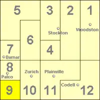 Rooks County was established with four townships: Bow Creek, Lowell, Paradise and Stockton. That number increased to seven by 1878[2] and twenty three in 1925. The twenty three townships were in place until 1971 when the number was reduced to the current twelve townships.[3]