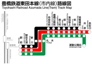 Azumada Main Line is a tram line in Toyohashi, Aichi Prefecture, Japan operated by Toyohashi Railroad. It connects Ekimae (situated in front of the JR and Meitetsu Toyohashi Station) to Akaiwaguchi and Ihara (one stop from Akaiwaguchi) to Undoukoen-mae. The line is referred to as Toyo-Tetsu Shinaisen by Toyohashi Railroad.[1] The railroad also operated another tram line, the Yagyu-bashi Branch Line, prior to 1976.