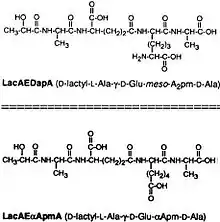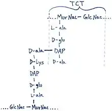 The DAP residue is responsible for directly bonding to the D-alanine peptide of another PGN molecule, thus aiding TCT's attachment within the cell wall.[9]