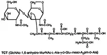 TCT is a soluble piece of peptidoglycan (PGN) found in the cell wall of all gram-negative bacteria.[4] Like all PGNs, TCT is composed of a disaccharide and a peptide chain. The IUPAC name for TCT is N-acetylglucosaminyl-1,6-anhydro-N-acetylmuramyl-(L)-alanyl-γ-(D)-glutamyl-mesodiaminopimelyl-(D)-alanine.[8] It is classified as a DAP (diaminopimelic acid)-type PGN due to the third amino group within the chain being a diaminopimelyl peptide.