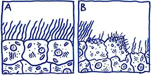 Illustration showing the effects of TCT on human ciliated epithelial cells. Figure A illustrates normal human epithelial tissue. Figure B illustrates normal human epithelial tissue after incubation with TCT. Notice the damaged and extruded ciliated epithelial cells in Figure B.