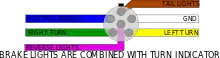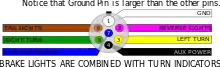 This contact is less common, and may have completely different wiring than that shown here. The wiring is same as for the 6-pin round connector with center pin (Reversing lamps) excluded.