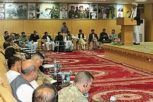 The Commander of Resolute Support, Gen. John Nicholson, visited Train, Advise, and Assist Command South to meet with Afghan leaders in the Uruzgan province regarding concerns over the security of provincial district voting registration centers in Tarin Kowt, 14 May. The meeting was hosted by TAAC-S under the command of Brig. Gen. John W. Lathrop with the 40th Infantry Division of the California National Guard.