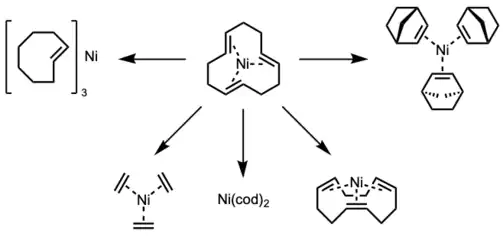 The all-trans-(cdt) ligand has been shown to be easily displaced with olefins such as trans-cyclooctene,[3] ethylene,[6] all-cis-(cdt),[7] norbornene,[6][8] to give the corresponding colorless 16-electron Ni(0)-olefin complexes with coplanar geometry. Ni(cod)2 can also be easily prepared from Ni(cdt).