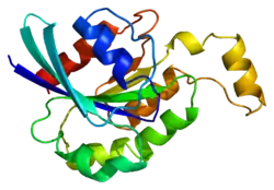Transforming protein RhoA, also known as Ras homolog family member A (RhoA), is a small GTPase protein in the Rho family of GTPases that in humans is encoded by the RHOA gene.[5] While the effects of RhoA activity are not all well known, it is primarily associated with cytoskeleton regulation, mostly actin stress fibers formation and actomyosin contractility. It acts upon several effectors. Among them, ROCK1 (Rho-associated, coiled-coil containing protein kinase 1) and DIAPH1 (Diaphanous Homologue 1, a.k.a. hDia1, homologue to mDia1 in mouse, diaphanous in Drosophila) are the best described. RhoA, and the other Rho GTPases, are part of a larger family of related proteins known as the Ras superfamily, a family of proteins involved in the regulation and timing of cell division. RhoA is one of the oldest Rho GTPases, with homologues present in the genomes since 1.5 billion years. As a consequence, RhoA is somehow involved in many cellular processes which emerged throughout evolution. RhoA specifically is regarded as a prominent regulatory factor in other functions such as the regulation of cytoskeletal dynamics, transcription, cell cycle progression and cell transformation.