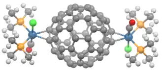 - ↑ Alan L. Balch; Joong W. Lee; Bruce C. Noll; Marilyn M. Olmstead (1994). "Multiple Additions of Vaska-Type Iridium Complexes to C60. Preferential Crystallization of the "Para" Double Addition Products: C60{Ir(CO)Cl(PMe3)2}2.2C6H6 and C60{Ir(CO)Cl(PEt3)2}2.C6H6". Inorg. Chem. 33: 5238–5243. doi:10.1021/ic00101a015.