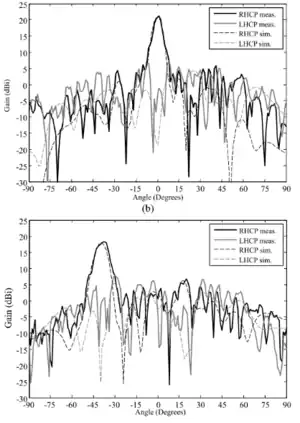 First, consider fixed transmitarrays. At each location on the surface of the structure, the unit cells are physically scaled or rotated in order to obtain the required amplitude and phase distribution. Thus, only one focusing direction is available. The aim is to approximate the ideal phase distribution, such as for a feed located at , which can be achieved by discretising the surface of the transmitarray into several Fresnel zones. High aperture efficiency (55%) can be achieved at oblique angles of incidence using precision-machined double split ring slot unit cells.[7] A switched-beam transmitarray covering the 57 – 66 GHz band has been reported.[8] Three different types of unit cells were used, based on patches and coupling slots. Similarly, a 60 GHz design used unit cells with a 2-bit phase resolution and selected an optimal ratio to widen the bandwidth.[9] When = 0.5, a scan loss of 2.2 dB was achieved at a 30° steering angle.
