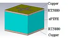 Crossed slot 2-layer unit cell: side view showing dielectric and conductor layers.[36]