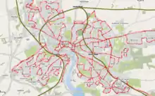 Urban transport within Ipswich is primarily based on the local road network based both on the historical street pattern and on newer roads. The town centre has been pedestrianised and there are a number of parks, footpaths and cycle routes. A small number of the paths have been identified as rights of way.[1]