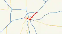 Following the I-5 junction, US 50 runs on a freeway section commonly referred to as the WX Freeway[3] due to it being flanked by the parallel one-way W & X Streets, along the south side of Downtown Sacramento. This part of the freeway is also built upon a raised embankment, to allow the many city streets to pass under it. The route then hits an interchange with a crossing freeway where Business 80 is the route heading north, and SR 99 is the route heading south.