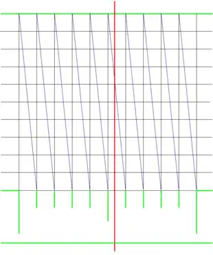 As seen in the illustration on the right, once the grid was scribed, diagonals (transverse lines) were scribed from the uppermost corner of a column in the grid to the opposite lowest corner. This line intersects the cross lines in the grid in equal intervals. By using an indicator such as a cursor or alidade, or by measuring using a pair of dividers with points on the same horizontal grid line, the closest point where the transversal crosses the grid is determined. That indicates the fraction of the graduation for the measure.