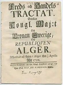 Treaty between Algiers and Sweden (1729) was the first treaty between Sweden and Regency of Algiers[1] and acted as a peace and trade treaty, it regarded the treatment of Swedish captives in Algeria, and in return for regular tribute Swedish ships were to carry special passes and would be granted immunity from attack in the Mediterranean sea.[1]
