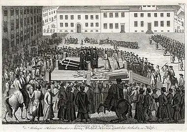 Jesuits were badly beaten, portraits of Catholic saints were destroyed, and part of the altar was damaged. The Lutherans also gathered a pile of Catholic books and paintings, which were set on fire outside the monastery.[8] After these events, the Jesuits sued the City in the Polish Supreme Court in Warsaw. The court, directed by King Augustus II,[lower-alpha 3] issued a verdict where thirteen Lutherans were set to be executed.[9]