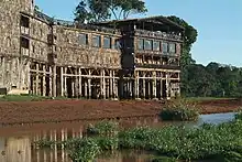 Treetops Hotel was a hotel in Aberdare National Park in Kenya near the township of Nyeri, 1,966 m (6,450 ft) above sea level on the Aberdare Range and in sight of Mount Kenya. First opened in 1932 by Eric Sherbrooke Walker, it was built into the tops of the trees of Aberdare National Park as a treehouse, offering the guests a close view of the local wildlife. The idea was to provide a machan (hunting platform on a tree during shikar in India) experience in relative safety and comfort. From the original modest two-room tree house, it has grown into a 35-room hotel. The original structure was burned down by The Kenya Land and Freedom Army (KLFA) during the 1954 Mau Mau Uprising, but the hotel was rebuilt near the same waterhole and has become fashionable for many of the rich and famous.[1] It includes observation lounges and ground-level photographic hides from which guests can observe the local wildlife which comes to the nearby waterholes. The hotel closed in October 2021.[2]