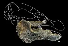 Trichechus hesperamazonicus is known by two fragmentary mandibles and part of the palate. Compared with other manatees, it has a wide space between the posterior lower tooth row and ascending ramus of dentary, where the buccinator muscle is located, and a wide ascending ramus of the mandible, which covers the posterior end of the tooth row.[1][3] It also shares some characteristics with living species, as relatively few large teeth and few mental foramina as T. manatus and T. senegalensis (in contrast with the many smaller teeth and many mental foramina of T. inunguis) and a straight and shallow mandibular symphysis as T. inunguis and T. senegalensis (in contrast with the downturned snout and deep mandibular symphysis of T. manatus).[1] The affinities of this species are still not fully resolved, being recovered in a polytomy with T. inunguis and a clade formed by T. manatus and T. senegalensis:[1]