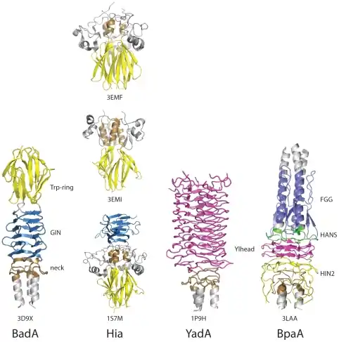 - 1 2 3 4 Łyskowski A, Leo JC, Goldman A (2011). "Structure and Biology of Trimeric Autotransporter Adhesins". Bacterial Adhesion. Advances in Experimental Medicine and Biology. Vol. 715. pp. 143–58. doi:10.1007/978-94-007-0940-9_9. ISBN 978-94-007-0939-3. PMID 21557062.