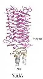- 1 2 3 Koretke KK, Szczesny P, Gruber M, Lupas AN (2006). "Model structure of the prototypical non-fimbrial adhesin YadA of Yersinia enterocolitica". J Struct Biol. 155 (2): 154–61. doi:10.1016/j.jsb.2006.03.012. PMID 16675268.