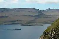 Trongisvágsfjørður and Tjaldavíksholmur, the ferry Smyril is approaching the port of Krambatangi.