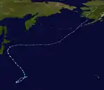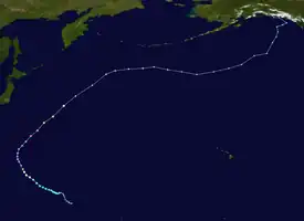On August 11, a weakening Hurricane Dora moved into the basin from the Central Pacific basin.[134] At 00:00 UTC, August 12, the JMA and the JTWC initiated advisories on Dora, declaring that it had just crossed the International Date Line and classifying it as a typhoon.[135] The cloud tops further warmed and its eye vanished from satellite imagery.[136] Dora showed significant deterioration along the system's northern flank.[137] Dora became increasingly sheared by early August 13, interacting with an upper-level trough.[138] Vertical wind shear exceeded 35 km/h (25 mph). Further decay in the organization of the storm's deep convection caused Dora to be downgraded to a tropical storm.[139] With Dora's ragged center, the system remained disorganized, as wind shear was becoming displaced to the east.[140][141] By the early hours of August 15, both agencies issued their final warnings on Dora; its LLCC further became broad and exposed.[142][143] The JTWC and the JMA continued tracking Dora until 06:00 UTC on August 22, as Dora exited the basin as a subtropical depression.[144][145]