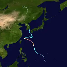 As of August 18, 13 deaths were reported and 16 are reported to have gone missing following the typhoon,[106] another 115 remain injured, and damage totaled at US$98.1 million.[107] At least 160,000 homes lost power across the island chain.[108][109] Khanun became the first to pass through the Korean Peninsula from south to north since recordkeeping began in 1951.[110] The Korean Central Television reported wind speeds of more than 18 km/h (11 mph) with averaging 181 mm (7.1 in) in Kangwon Province.[111] Although Khanun did not directly affect the Philippines, both Khanun and Typhoon Doksuri enhanced the monsoon for several days, which caused severe flooding throughout the country.[112]
