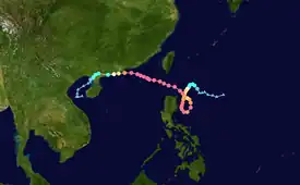 On July 12, an area of low-pressure was noted off the coast of Aurora, Philippines. JMA later recognized the formation of a tropical depression.[58] PAGASA later named the system Dodong as it is inside Philippine Area of Responsibility.[59] It made its first landfall in Dinapigue, Aurora and continued to cross over Cagayan and Isabela. JTWC later designated for the now-tropical depression as 04W.[60] Prior exiting PAR, JMA subsequently named Talim as it intensified into a tropical storm.[61][62][63] The system had a broad LLCC with deep convection persisting along the western and southern periphery.[64] Talim continues to intensify in the South China Sea, later being strengthen into a severe tropical storm as it moves westward within a favorable environment being offset by equatorward outflow. JTWC later upgraded into a Category 2-equivalent typhoon with winds of around 155 km/h (100 mph).[65][66] Talim made its second landfall in Zhanjiang, Guangdong, with winds of 136 km/h (85 mph) on July 17. As it moved further inland, Talim rapidly weakened. Shortly after the landfall, the JTWC discontinued warnings on the system before it dissipated on the next day.[67]