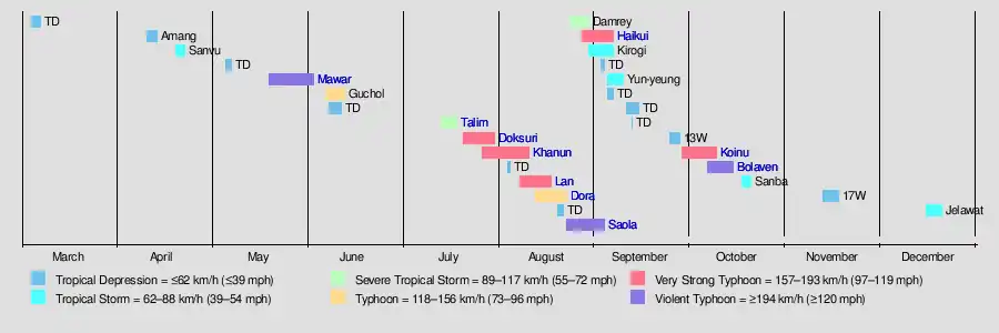 The season ran throughout 2023, though most tropical cyclones typically develop between May and October. The season's first named storm, Sanvu, formed on April 21, while its last named storm, Jelawat, dissipated on December 20. In May, Typhoon Mawar intensified into the first typhoon of the season on May 21, later becoming one of the strongest Northern Hemisphere tropical cyclones on record in May, and the second strongest early-season tropical cyclone, only behind Typhoon Surigae in April 2021.[3]