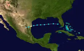 A well-organized tropical wave tracked quickly through the Lesser Antilles on July 7, producing tropical storm force winds but failing to attain a low-level circulation. After organizing in the Caribbean, it developed into Tropical Storm Claudette to the south of the Dominican Republic on July 8. Its intensity fluctuated over the subsequent days, attaining hurricane status briefly on July 10 before weakening and hitting Puerto Morelos on the Yucatán Peninsula on July 11 as a tropical storm. The storm remained disorganized due to moderate wind shear, though after turning west-northwestward into an area of lighter shear, it re-attained hurricane status on July 15 off the coast of Texas; it intensified quickly and made landfall on Matagorda Island with peak winds of 90 mph (140 km/h). It slowly weakened after moving ashore, tracking across northern Tamaulipas before dissipating in northwestern Chihuahua.[17]