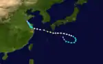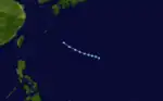 Development of this system was slow within the eastern portion of the monsoon trough. By midday on July 2, the disturbance was first noted about 1,020 kilometres (630 mi) southwest of Guam. The system moved northwest for much of its life cycle, initially following Alex and then the southwest side of the subtropical ridge. A broad tropical depression formed on the afternoon on July 5 within the disturbed weather area, weakening as it passed over Luzon. Late on July 7, ship reports indicated the system had become a tropical storm. The cyclone moved within the radar fence of Hong Kong near its peak intensity before making landfall 250 kilometres (160 mi) to its west-southwest during the early afternoon of July 9. Winds gusted to 70 knots (130 km/h) at Green Island.[1] Weakening over the topography of China was rapid thereafter, and the system dissipated by early on July 10.[5]