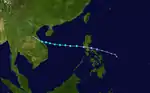 A circulation was first reported from a ship 300 miles west of Guam on September 26. The system then quickly intensified into a typhoon and made a northward turn directly towards Japan. During this period, a favorable environment allowed the typhoon to intensify to peak winds of 160 mph. The storm then turned westwards, passing 15 miles under Okinawa. The town of Naha, Okinawa received sustained winds of 85 mph with gusts of 120 mph. The much-weakened typhoon made landfall on the Chinese mainland 100 miles south of Shanghai on October 4. It caused 11 deaths, over $6 million in crop damage, and the Lebanese merchant ship Sheik ran aground off of Kitadaitōjima, killing 2. The Taiwanese military exercise Sky Soldier was canceled due to the typhoon. The system then recurved outwards due to westerly winds into the Sea of Japan with sustained winds of 30 mph. The remnants began an extratropical transition and dissipated in the Sea of Okhotsk.[9]