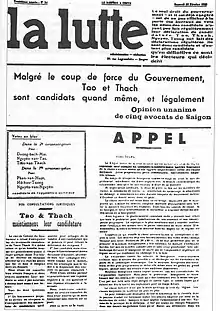 In 1933, several factional representatives, including Tạ Thu Thâu, Nguyễn Văn Tạo of the ICP [later to be labour minister in Hanoi][9] and the anarchist Trinh Hung Ngau, regrouped around charismatic figure of Nguyễn An Ninh, and took the initiative of legally opposing the colonial regime in the Saigon municipal elections of April–May 1933. They put forward a common "Workers' List" and briefly published a newspaper (in French to get around the print restrictions on Vietnamese), La Lutte (The Struggle) to rally support for it. In spite of the restricted franchise, two of this Struggle group were elected (although denied their seats), the independent (later Trotskyist) Tran Van Thach and Nguyễn Văn Tạo.