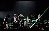 A screenshot of Tsubasa, depicting the green lasers and the band playing the song