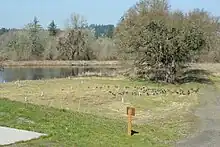 The refuge is home to almost 200 species of birds, more than 50 mammal species, and 25 species of reptiles and amphibians.[25] Tree species include red alder, aspen, maple, oak, Oregon white ash, Douglas fir, ponderosa pine, Pacific yew, and cedar.[5][6][12][28] A pair of 350-year-old oak trees can be found at the visitor center.[9] Plant species in the refuge include bulrushes, wapato, water plantain, as Oregon grape, wild trillium, camas, iris, snowberry, cattails, wild millet, wild rose, thimbleberry, and others.[6][8][9][12][28] Wildflowers include blue chicory, Douglas spirea, and purple crocuses.[29]