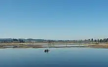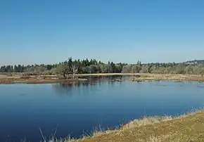 Wapato Lake Unit is located about 15 miles (24 km) to the west of the main refuge, near the city of Gaston along Oregon Route 47 in Washington and Yamhill counties.[16][37] The area was once the site of Wapato Lake, whose soil held an organic-rich peat that sustained a shrub swamp ecosystem. The wapato plant (Sagittaria latifolia) grew in the upper marsh of the Wapato Lake Basin and was harvested by Native Americans.[33][38] In 1892, attempts began to drain the 800 acres (320 ha) lake to increase farmland,[16][39] with the Wapato Improvement District completing the effort in the 1930s.[40] Valley forests, prairies, and wetlands encompass the region today,[33] including two small streams, Ayers and Wapato creeks.[41]