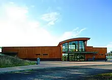 The 6,300-square-foot (590 m2) Wildlife Center was designed to give basic information and encourage visitors to then explore the wildlife in their natural habitats.[21][31] The building is sienna in color and was built with a flat roof that has gravel on top to provide nesting habitat for birds, one of the features designed to be environmentally friendly.[31][34] Built at a cost of $4.6 million, the Wildlife Center also has a large arced skylight and atrium in the center to provide much natural light.[31] Builders used local wood in the Wildlife Center, which has large, exposed beams. The center and headquarters are adjacent to each other off Oregon Route 99W on a knoll above a seasonal pond.[20]