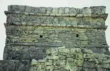 Tulum has architecture typical of Maya sites on the east coast of the Yucatán Peninsula. This architecture is recognized by a step running around the base of the building, which sits on a low substructure. Doorways of this type are usually narrow, with columns used as support if the building is big enough. As the walls flare out there are usually two sets of molding near the top. The room usually contains one or two small windows with an altar at the back wall, roofed by either a beam-and-rubble ceiling or being vaulted.[8] This type of architecture resembles what can be found in the nearby Chichen Itza, just on a much smaller scale.[4]