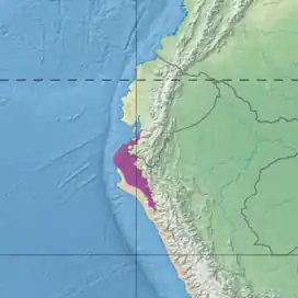 The Tumbes–Piura dry forests ecoregion has an area of 4,118,081 hectares (10,176,000 acres).[1] The northern tip is in the southern coastal plain of Ecuador, while most of the ecoregion is in the northwestern coastal plain of Peru. It covers all or part of the regions of Tumbes, Piura, Lambayeque and Cajamarca in northern Peru.[2] Further north the similar Ecuadorian dry forests extend along the coast of central Ecuador.[3] The Andes rise to the east.[1]