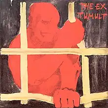 Right after recording their Dignity of Labour box set, The Ex returned to Koeienverhuur "Cow Rental" Studio to record the 13 songs for Tumult in January 1983. The Ex's perennial recordist Dolf Planteijdt, co-produced the album with Jon Langford of British bands The Mekons and The Three Johns, who was also recording the Dutch group Eton Crop in Dolf's studio.[1] The album saw release in April, one month after the band's previous release, and featured a gatefold sleeve along with a full-size poster in its original pressing.[4] The cover's stark red-white-and-black painting depicts a prisoner bending cell bars to break free,[5] The album's insert bore the phrase, The record's poster announces "hometaping is killing record companies...and it's about time."[6] this time adapted from Roode Hulp (“Red Help”) poster drawing attention to political prisoners needing aid.