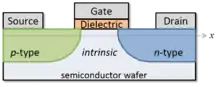 The basic TFET structure is similar to a MOSFET except that the source and drain terminals of a TFET are doped of opposite types (see figure). A common TFET device structure consists of a P-I-N (p-type, intrinsic, n-type) junction, in which the electrostatic potential of the intrinsic region is controlled by a gate terminal.