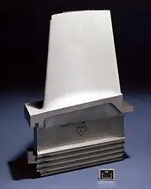 The development of superalloys in the 1940s and new processing methods such as vacuum induction melting in the 1950s greatly increased the temperature capability of turbine blades. Further processing methods like hot isostatic pressing improved the alloys used for turbine blades and increased turbine blade performance.[15] Modern turbine blades often use nickel-based superalloys that incorporate chromium, cobalt, and rhenium.[13][17]