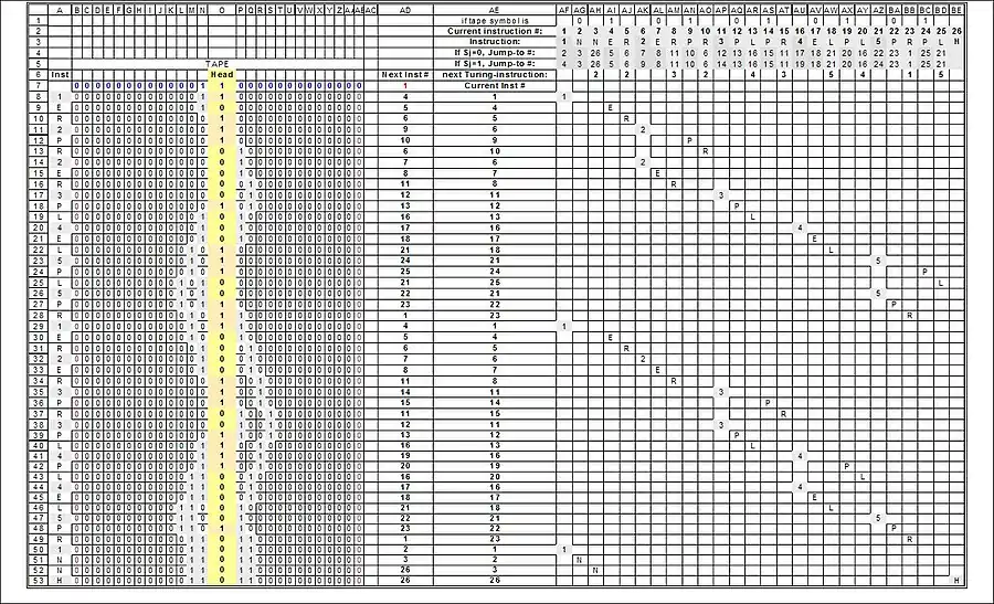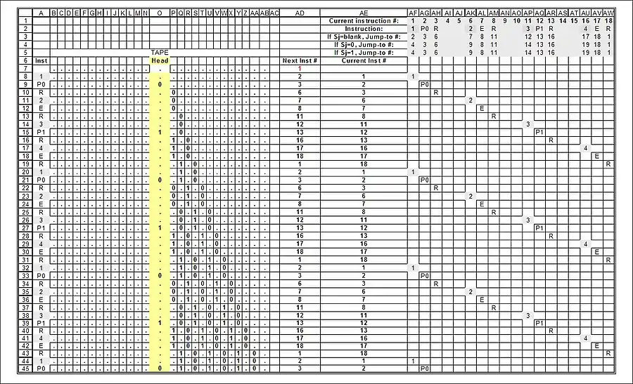 The full "run" of the 3-state busy beaver. The resulting Turing-states (what Turing called the "m-configurations" — "machine-configurations") are shown highlighted in grey in column A, and also under the machine's instructions (columns AF-AU)):