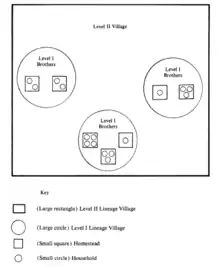 The Turu people define their social organization through lineage or ancestry. The photo to the right visualizes the social composition of the average Turu village. The first level lineage (level 1) is made up of adult brothers, and a second level lineage (level 2) is made up of several level 1 lineages. A Turu village is described as a single level 2 lineage. Several level 2 lineages make a clan (level 3), and several level 3 lineages make up a subtribe (level 4).[4]