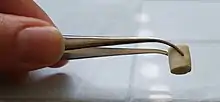 Tweezers come in a variety of tip shapes and sizes.[4] Blunt tip tweezers have a rounded end which can be used when a pointed object may get entangled, when manipulating cotton swabs, for example. Flat tip tweezers, pictured at right, have an angled tip which may be used for removing splinters. Some tweezers have a long needle-like tip which may be useful for reaching into small crevices. Triangular tip tweezers have larger, wider tips useful for gripping larger objects. Tweezers with curved tips also exist, sometimes called bent forceps. Microtweezers have an extremely small, pointed tip used for manipulating tiny electronic components and the like.
