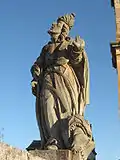Baruch holds forth a parchment whose quotations are a synthesis of several passages of his book. The sculpture, located on the pedestal that finishes off the wall alignment of the central courtyard, is a young and beardless figure, clad in short tunic, cloak, and boots. He wears a turban decorated with a brim similar to that of the prophet Jeremiah. With one hand he holds the folds of his mantle, while in the other he bears the parchment.[9] The piece, with its squat proportions and anatomical errors evident, is one of the weakest of the set. As with the other figures, however, the strength of the image comes from the expression on his face.