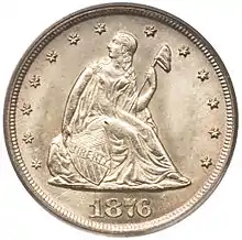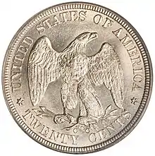 The American twenty-cent piece is a coin struck from 1875 to 1878, but only for collectors in the final two years. Proposed by Nevada Senator John P. Jones, it proved a failure due to confusion with the quarter, to which it was close in both size and value.