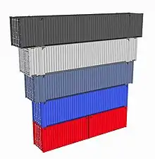 The standard intermodal container is designated as twenty feet (6.10 m) long and eight feet (2.44 m) wide.[1] Additionally there is a standard container with the same width but a doubled length of forty feet called a 40-foot (12.19 m) container, which equals one forty-foot equivalent unit (often FEU or feu) in cargo transportation (considered to be two TEU, see below).